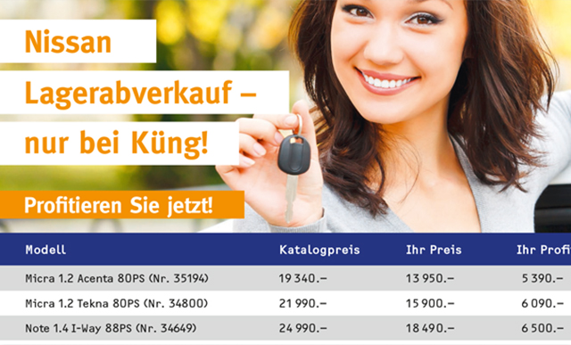 inserat, küng automobile, lagerabverkauf, nissan, print design