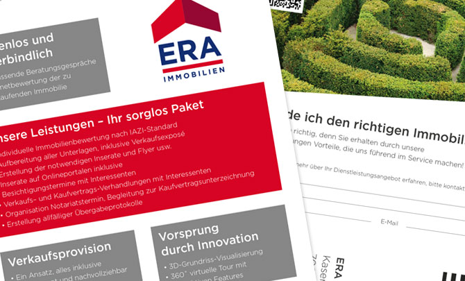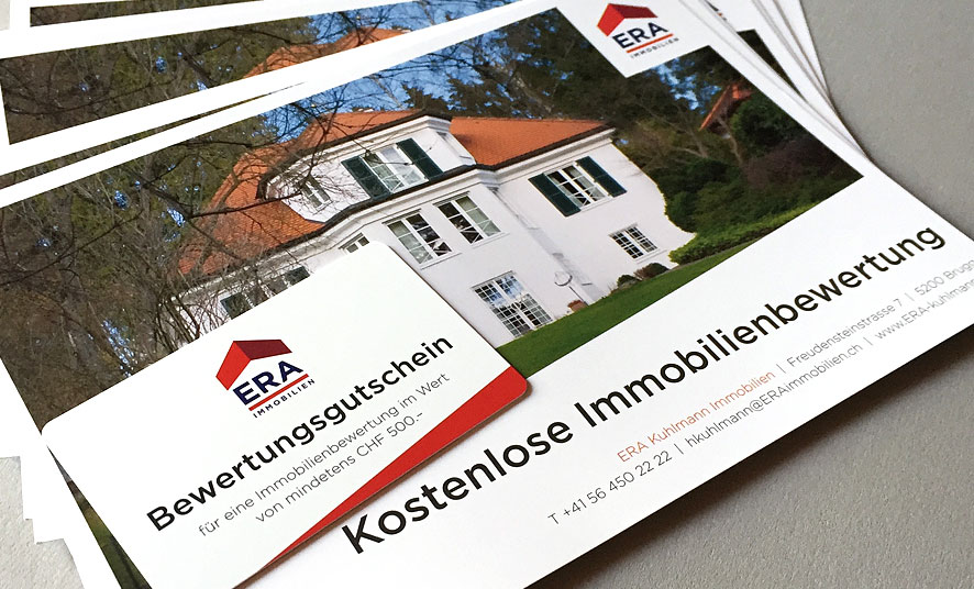 im auftrag der era immobilien habe ich diesen flyer und den dazugehörigen gutschein gemäss corporate design vorgaben gestaltet.