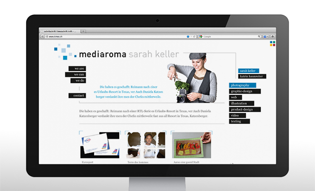 mediaroma ist unser full service netzwerk mit kreativ-power. wir bringen würze in die visuelle kommunikation – und dies ganz ohne firlefanz! im team haben wir vorschläge für die neue website erarbeitet. auf dieser soll den einzelnen mitgliedern genügend platz für ihre projekte zur verfügung stehen.