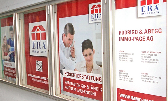 diese schaukästen für era rodrigo & abegg immo-page sind ein echter blickfang! weil es gleich ein paar davon gibt, wird garantiert jeder fussgänger darauf aufmerksam. hier kann man also tatsächlich von flächendeckender werbung sprechen…
